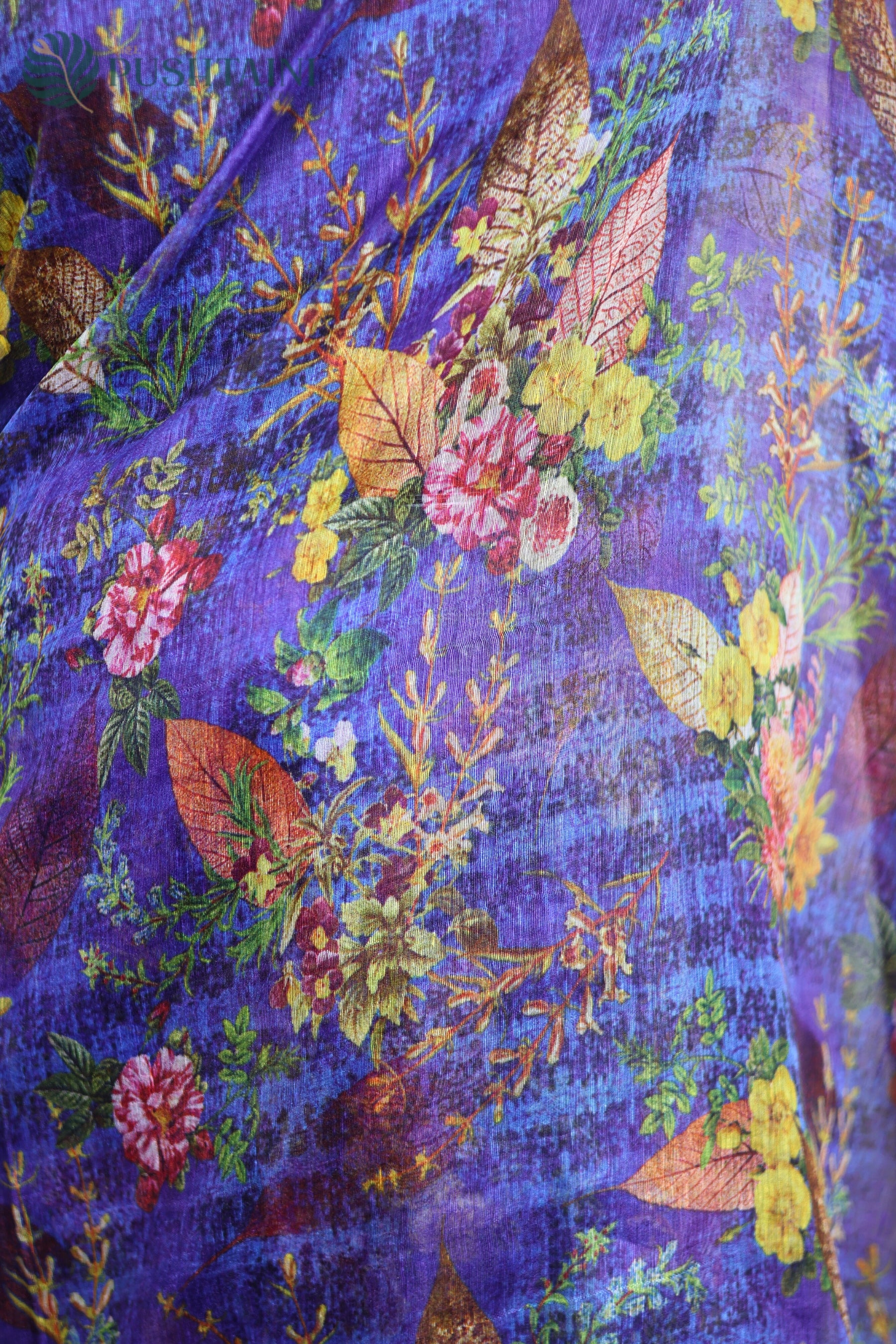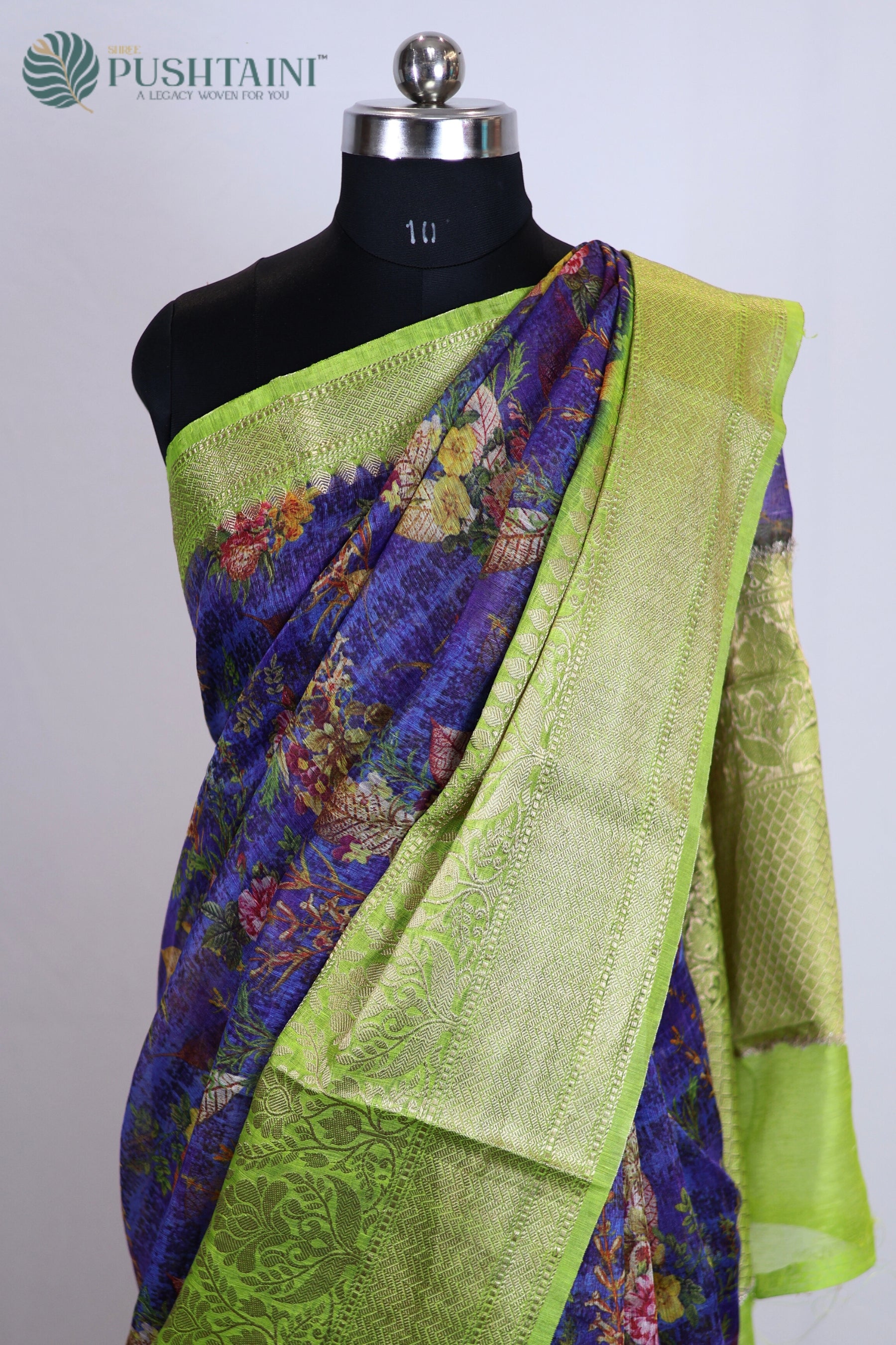 The soothing light green base paired with the rich navy accents creates a graceful contrast that stands out without being overwhelming. The digital prints add a modern artistic touch, giving the saree a refreshing blend of tradition and contemporary styling.