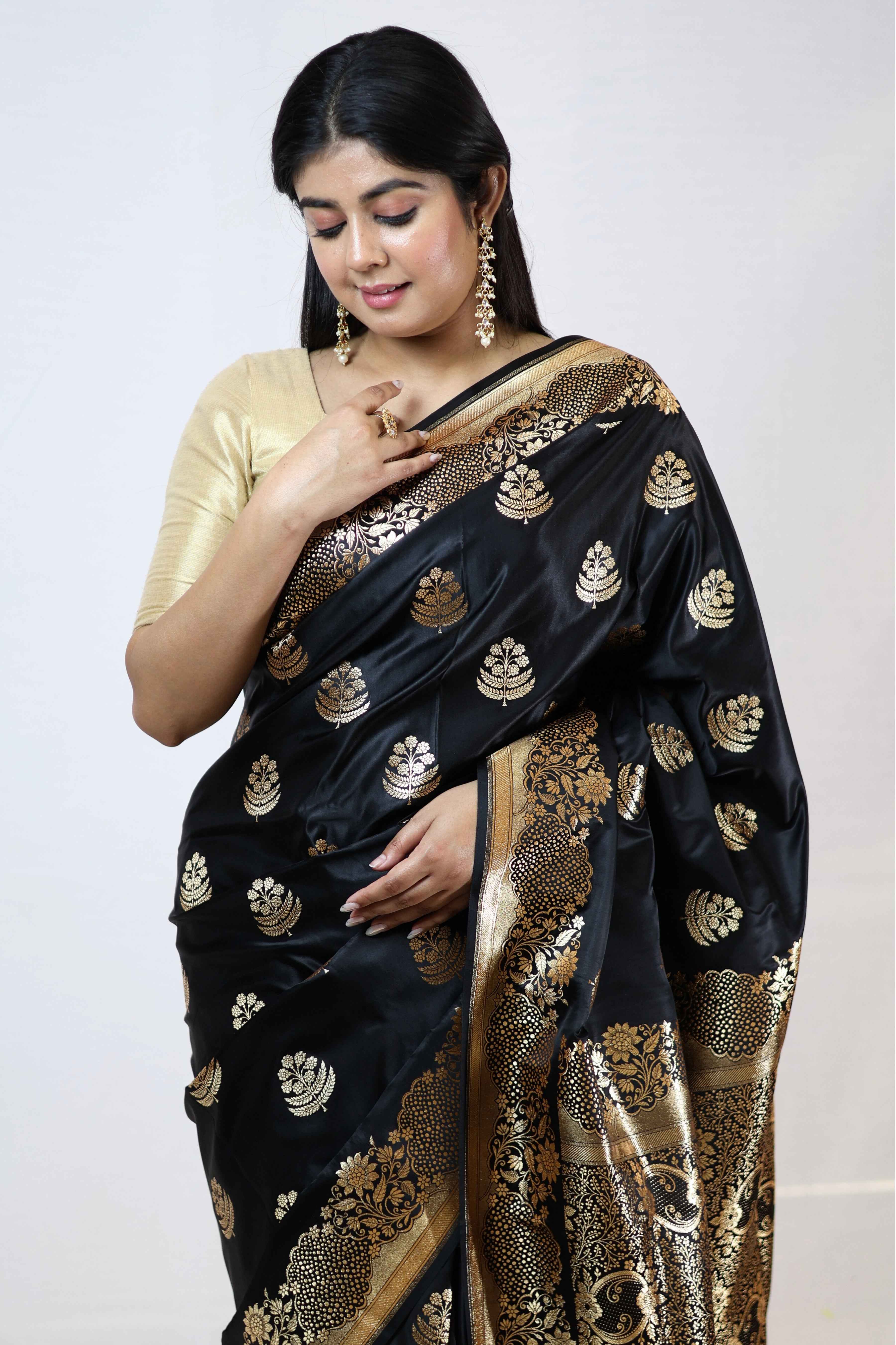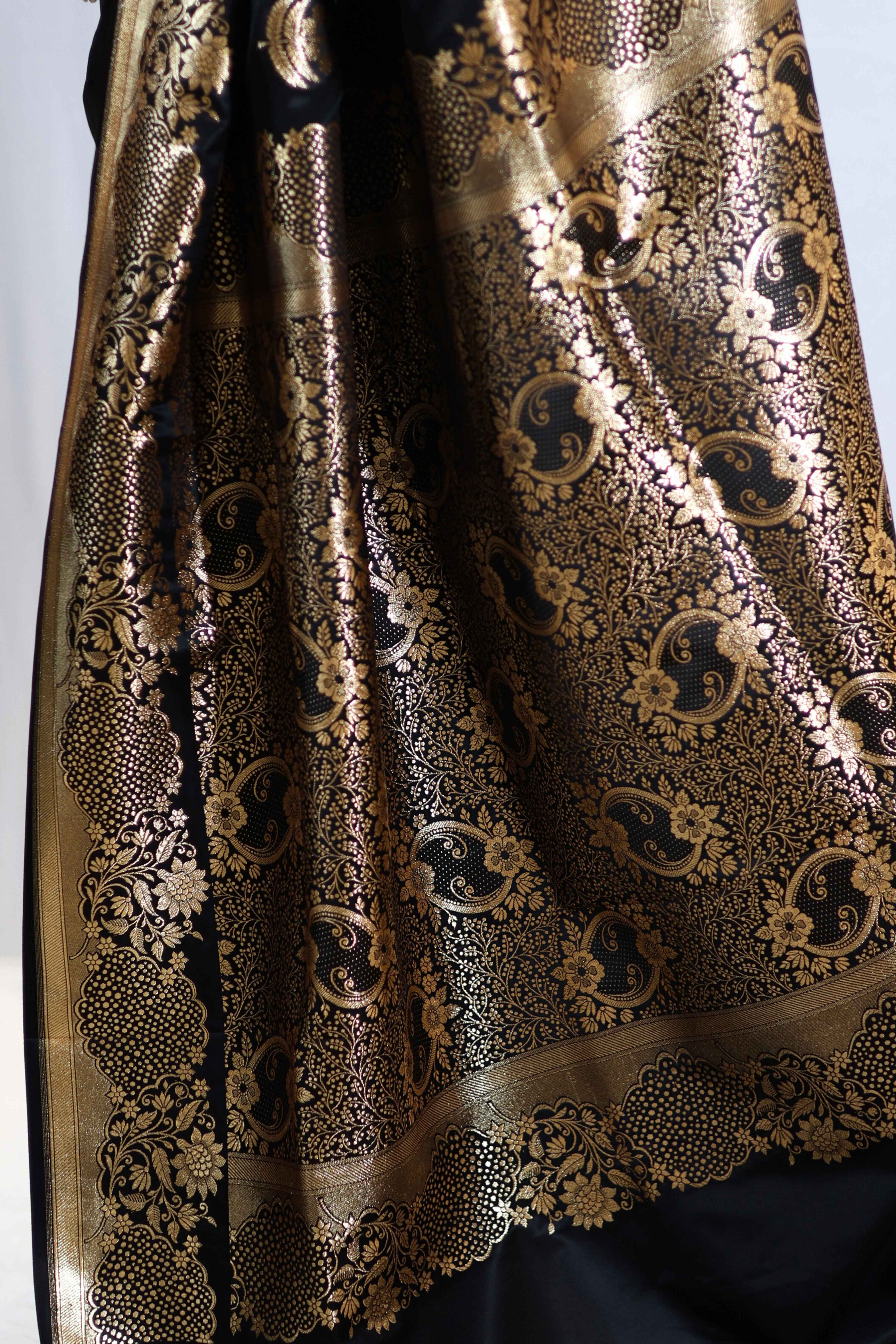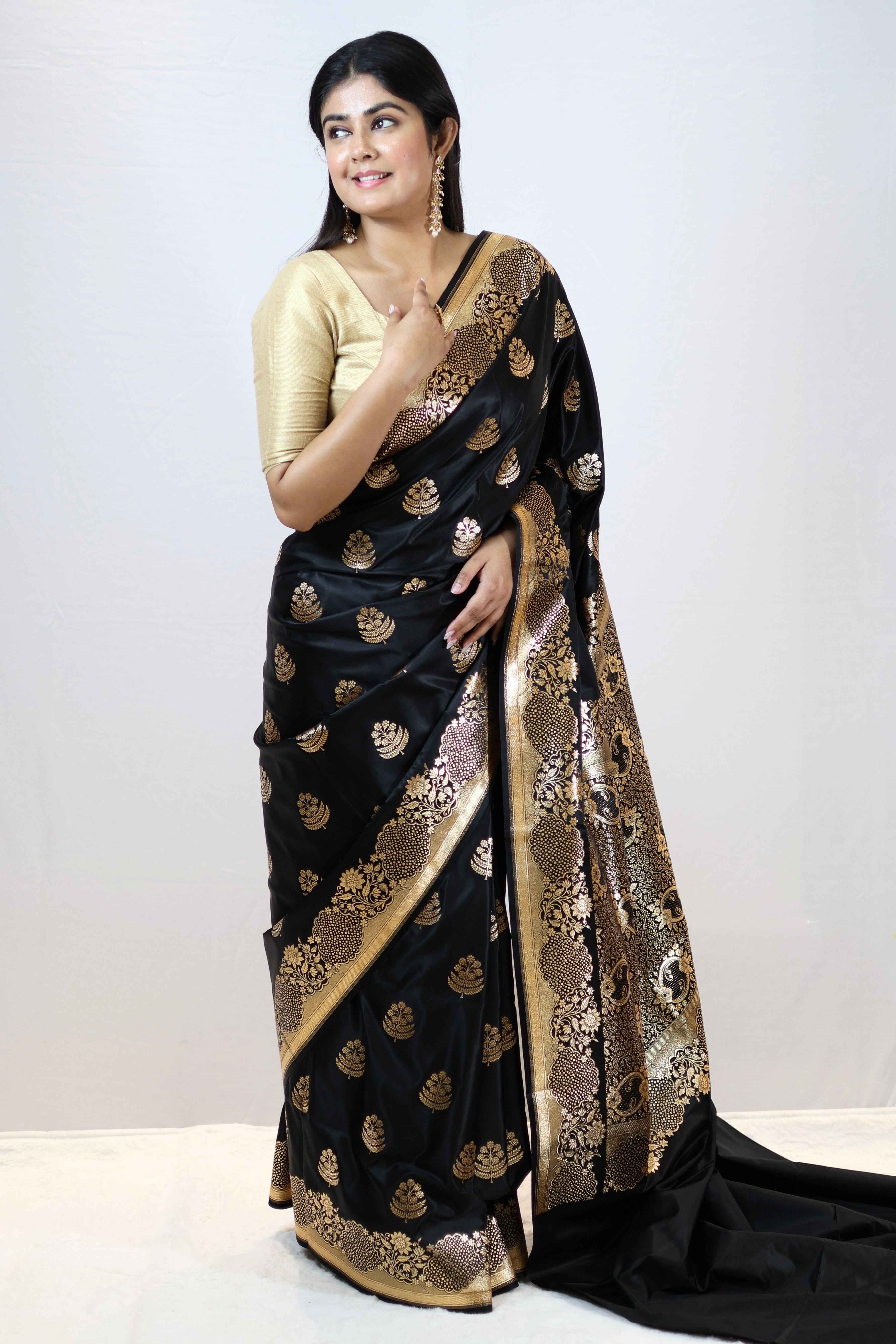 Draped in a deep, commanding shade of black, this Mashru Silk saree embodies timeless grace and refined luxury. Known for its smooth texture and gentle sheen, Mashru silk offers a distinctive richness that enhances the elegance of every fold.