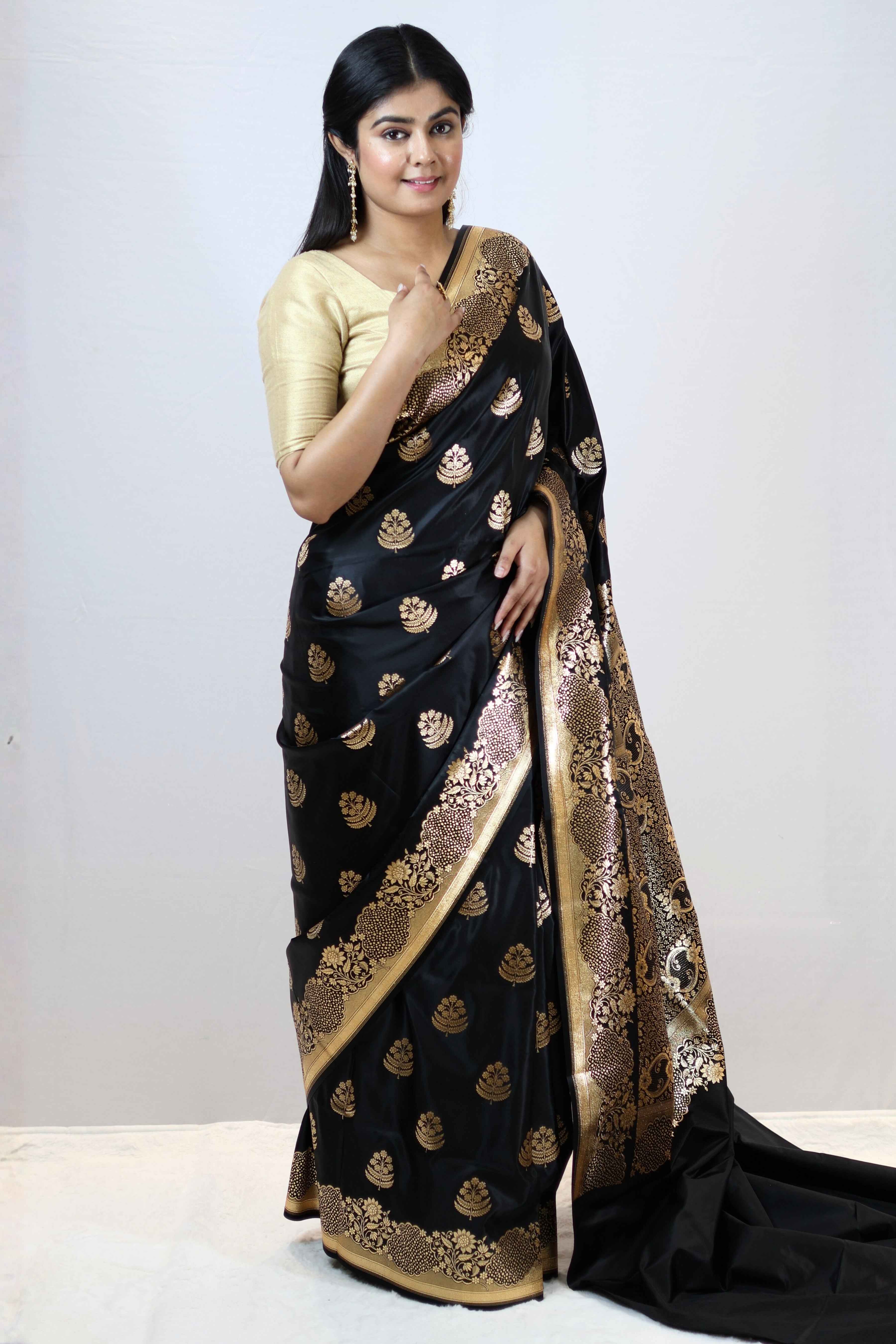 Minimal in design yet grand in presence, this black Mashru Silk saree celebrates the beauty of fine weaving and understated luxury. Perfect for festive gatherings, wedding functions, and evening occasions, it is a versatile statement piece that never goes out of style.