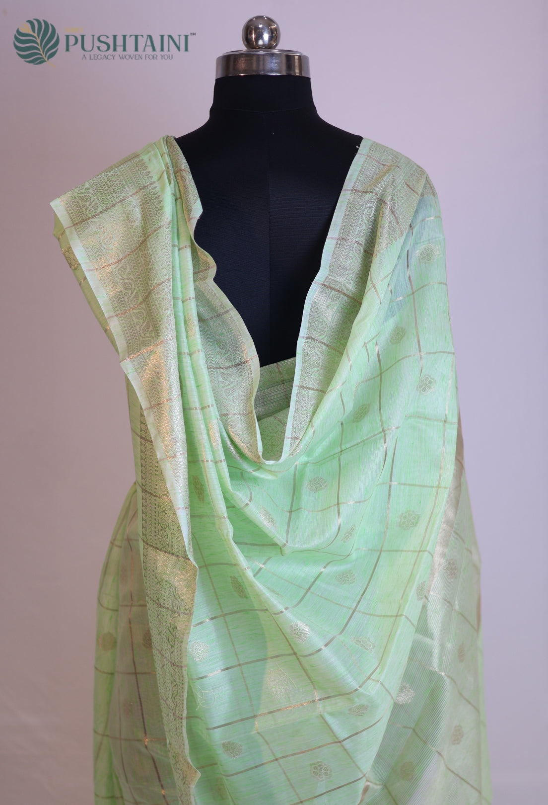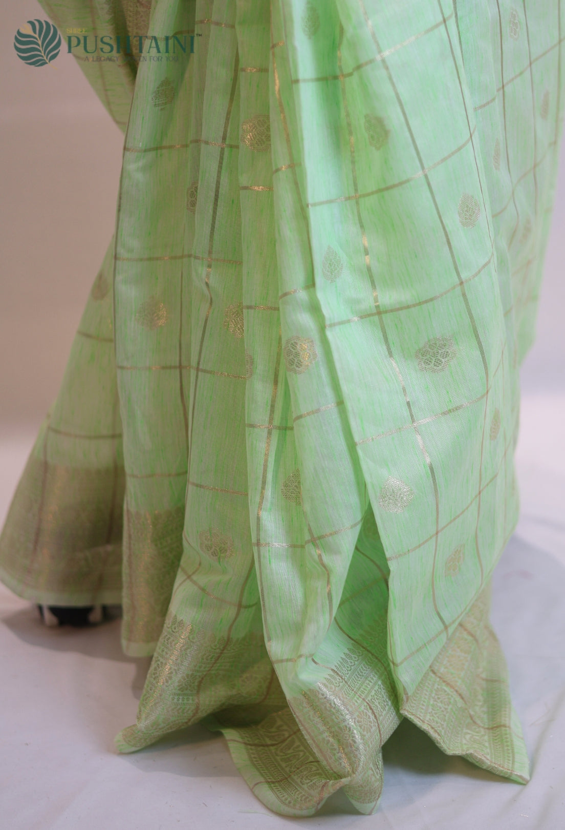 This pastel green Semi Linen saree features a serene, luminous hue beautifully complemented by intricate golden zari checks and delicately woven traditional buti motifs across the body, creating a refined balance of subtlety and richness. The Semi Linen fabric lends a soft, airy drape while preserving the elegance of a Banarasi saree, enhanced by a finely crafted handwoven border detailed with classic Banaras artistry. The zari work catches light gently, giving the saree a graceful sheen suitable for festive wear, intimate celebrations, and even as an understated wedding saree, making it a timeless addition to any refined wardrobe.