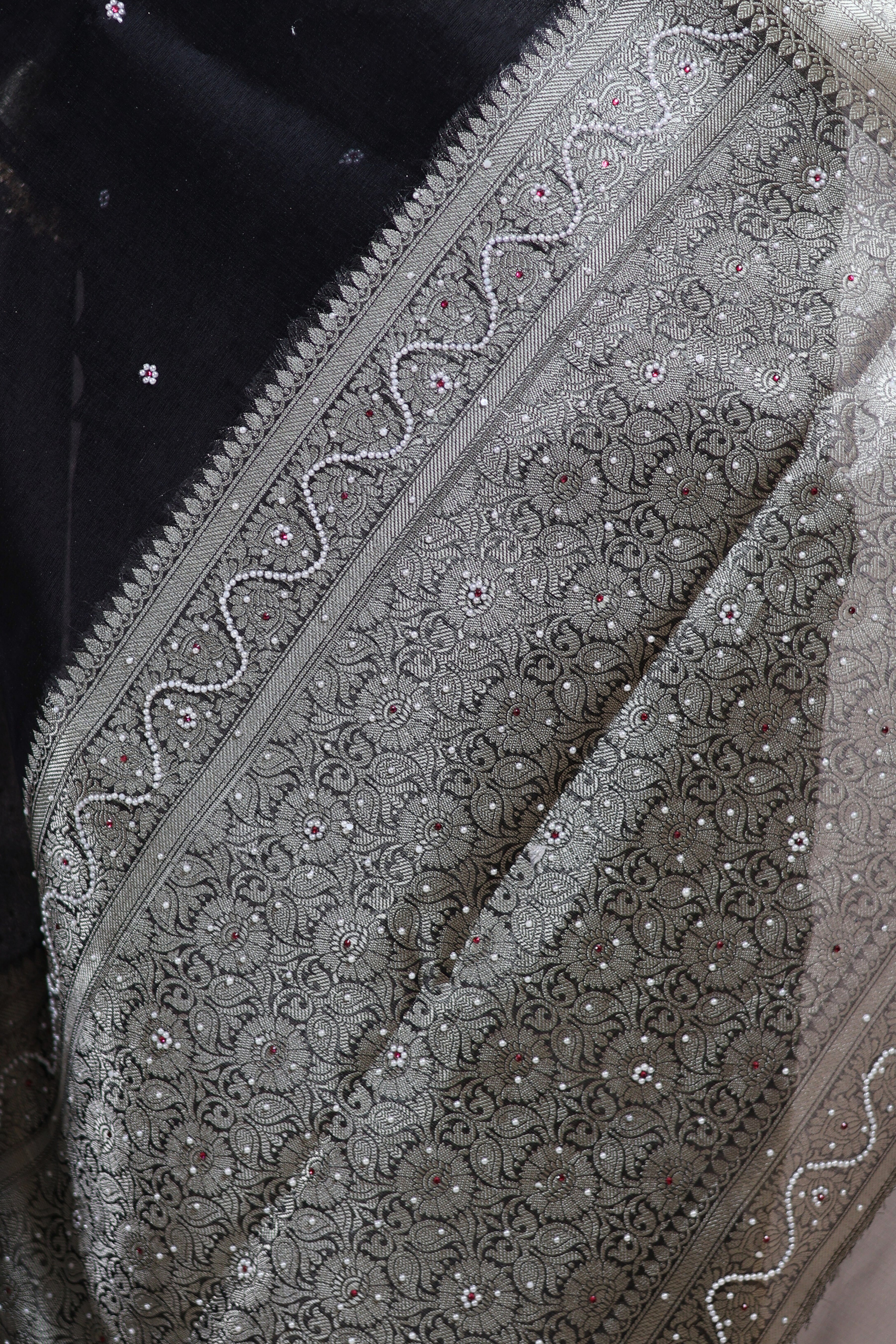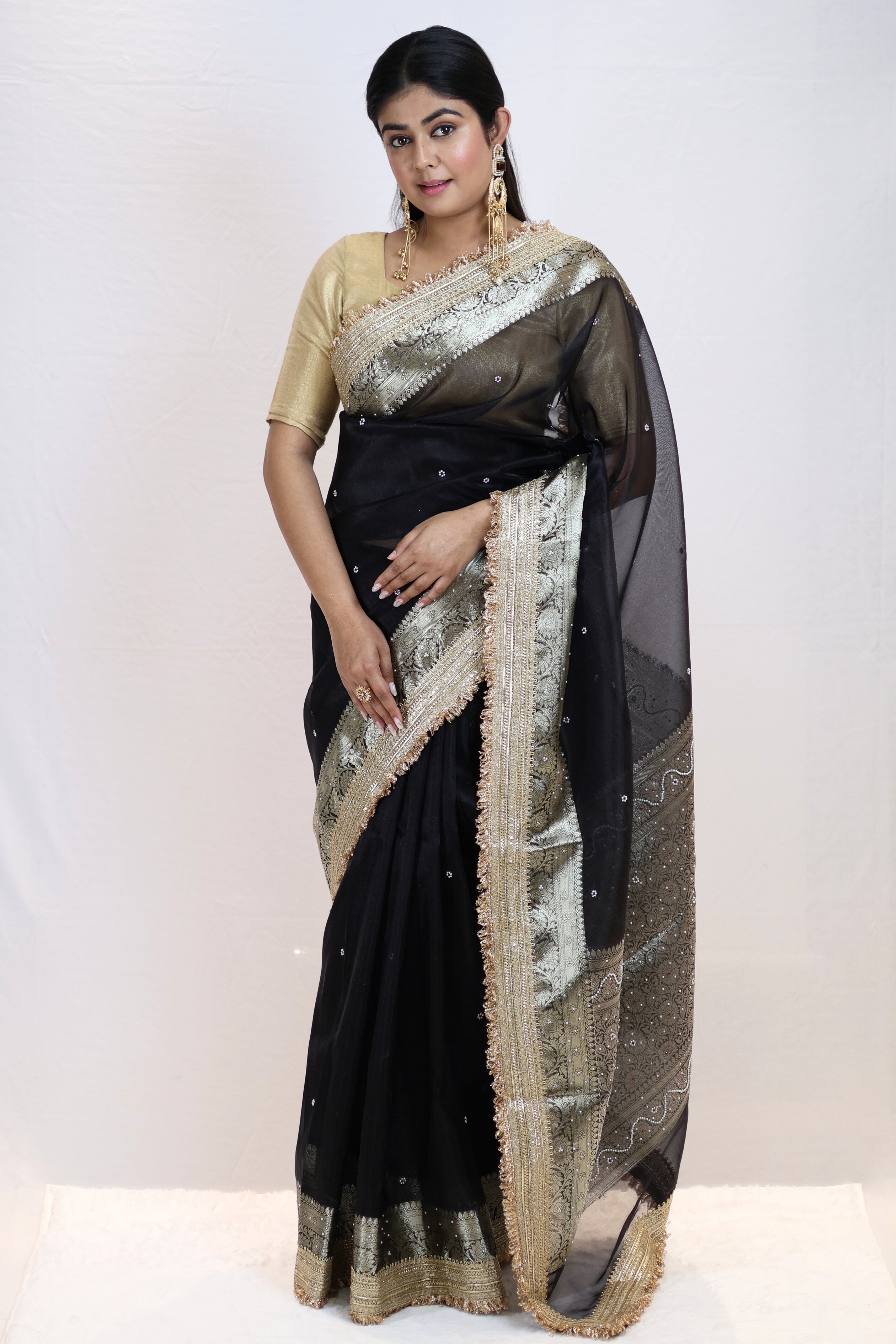 Crafted in rich black tissue silk, this saree features elegant stone embellishments that add a refined sparkle. The attached premium double lace border enhances its luxurious appeal, giving it a designer finish.